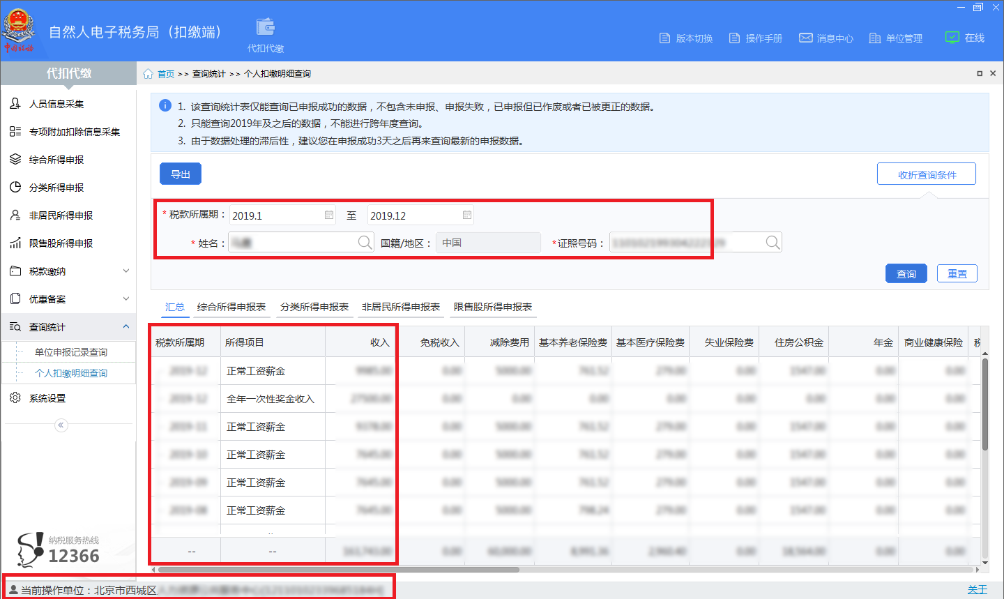 5. 近一年的应税材料。单位登录“自然人税收管理系统”,在代扣代缴项目栏的查询统计功能中点击个人扣缴明细查询,给予申请人近一年的报税截屏(样例参见附件4 ,须包含样例图示红框内容)